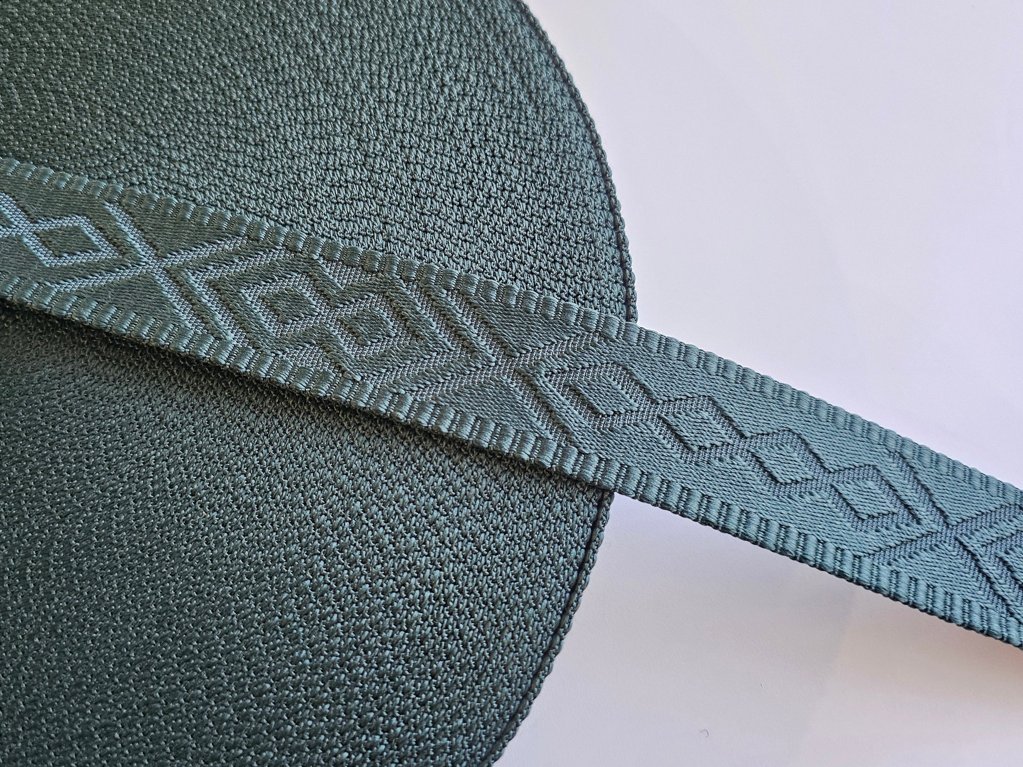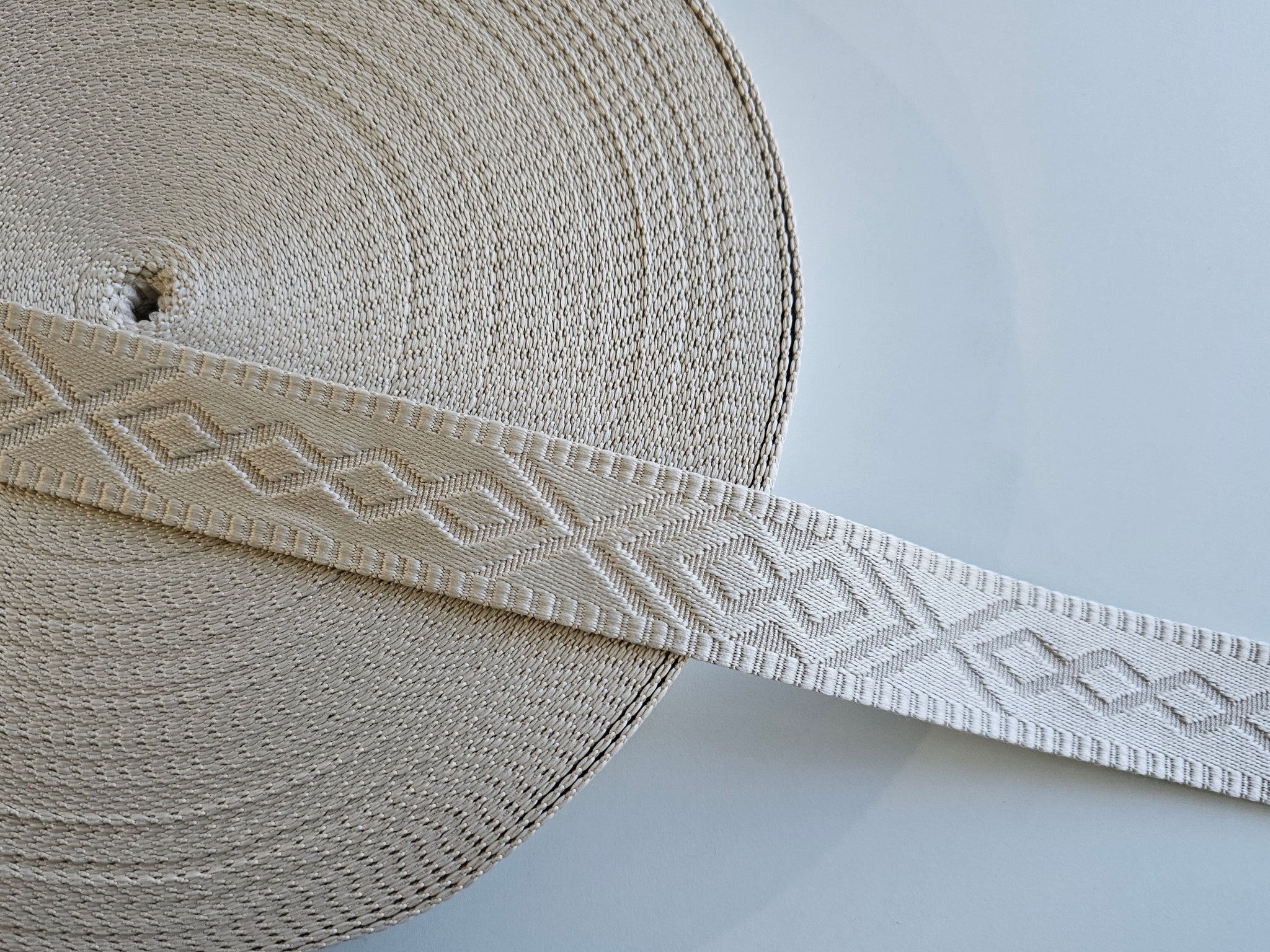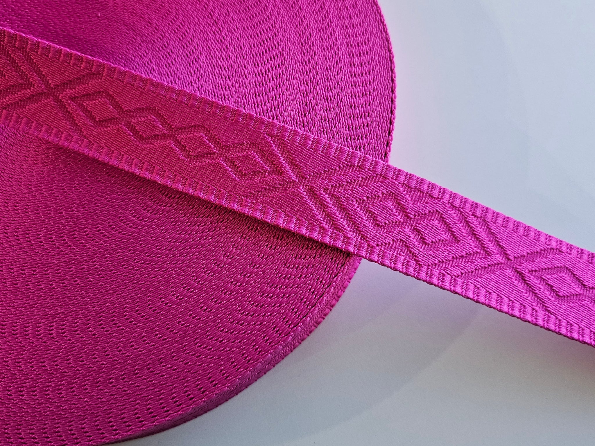 Our gorgeous 1.5 inch (38mm) Knots and Diamonds Weave webbing are a great alternative for bag straps. This luxurious webbing adds that little extra wow to a bag. These can be used on backpacks, handbags clutches or key fobs.