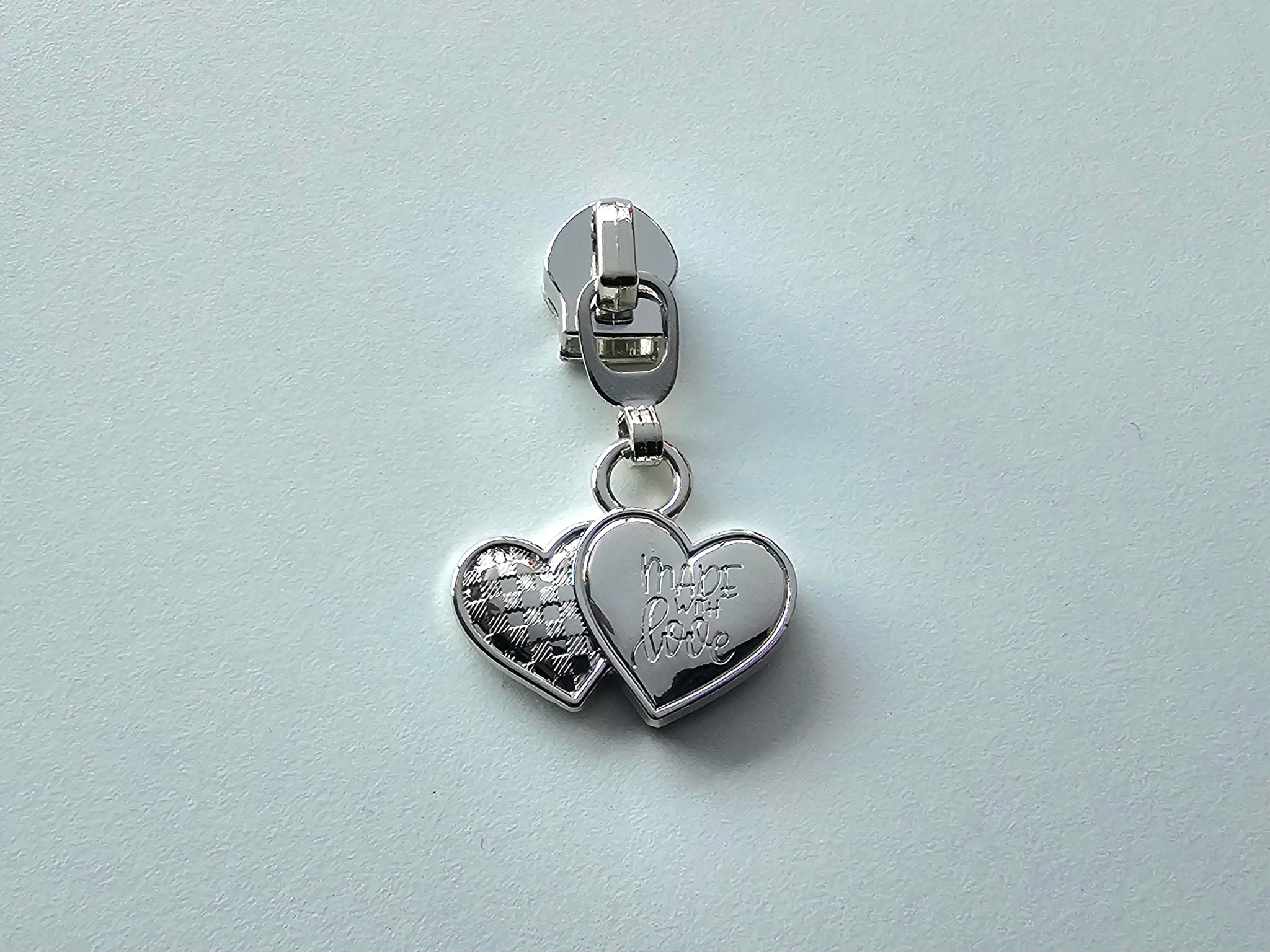 These exclusive double sided No. 5 zipper pull features the most intricate paired hearts. One heart has a plaid design and the other says Made with Love. These pair beautifully with our plaid and weave designed vinyl.