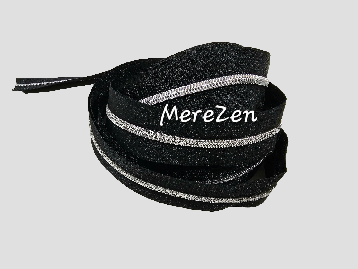 Nylon number 3 Black colour zipper tape with Silver teeth.
