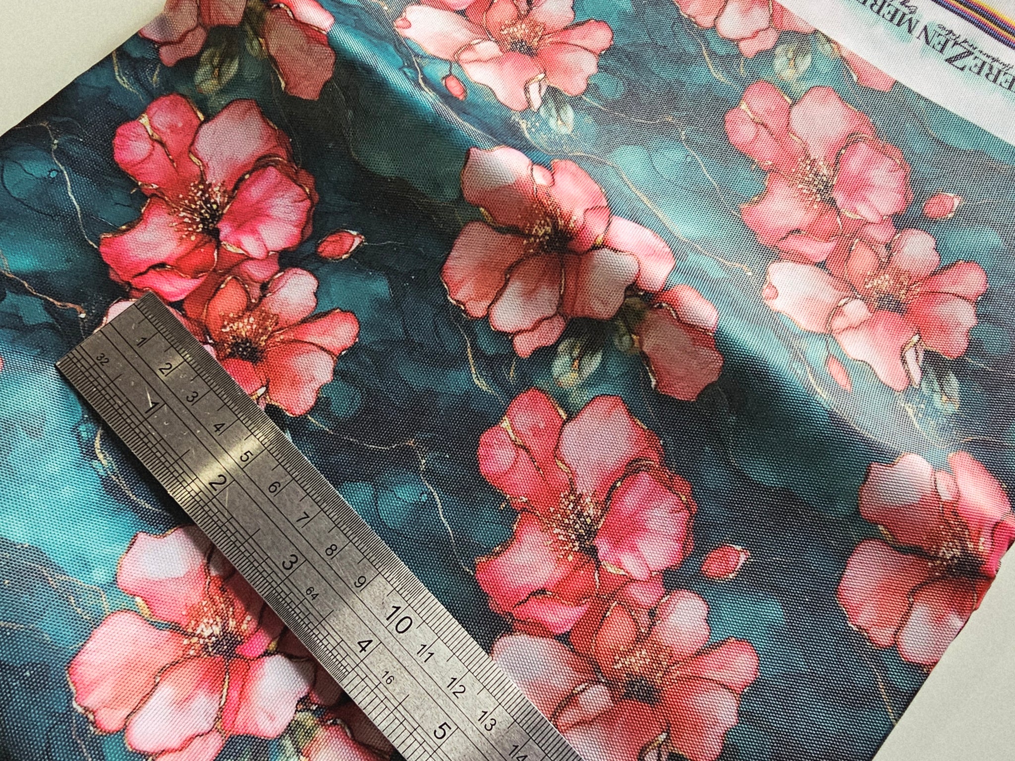 Our gorgeous new water resistant canvas in this ink petal print showcasing pink florals in the green teal tones is just perfect for your next make. This printed WRC is perfect for linings and super cost effective. This can be used for exteriors also making the perfect swim or cosmetic bags.