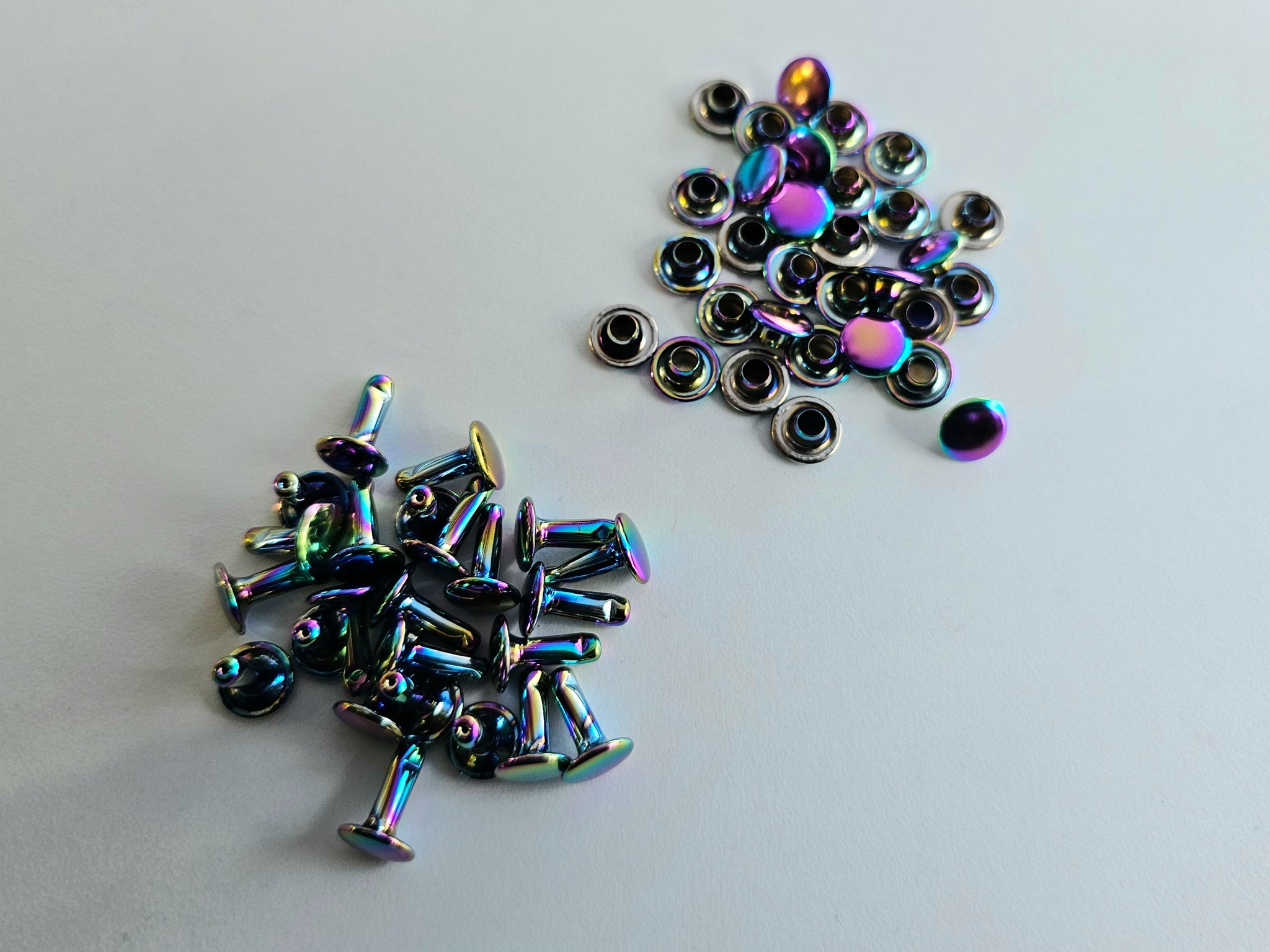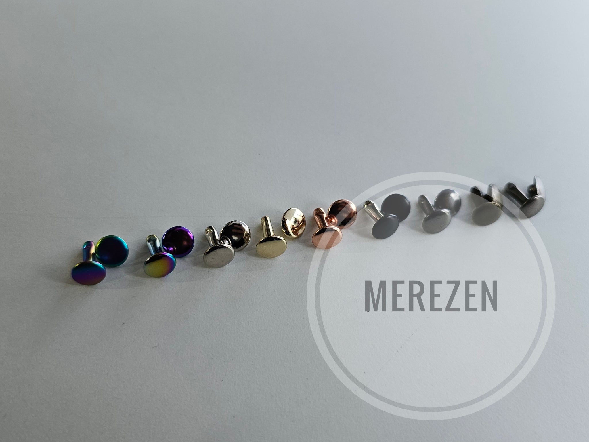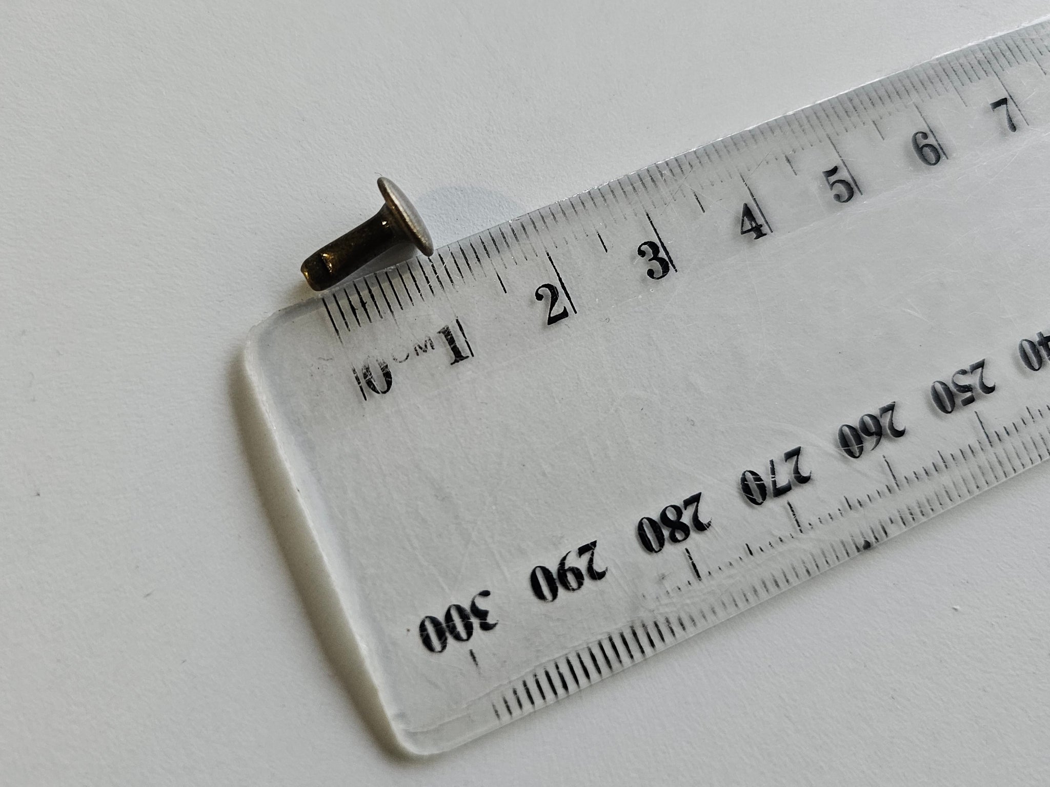 9mm wide by 10mm high rivets. These are used with a Rivet Press machine to hold in place. To use, punch a small hole through your layers, push the rivet in place with the cap on the other side and use a setting press tool to push together to hold.
